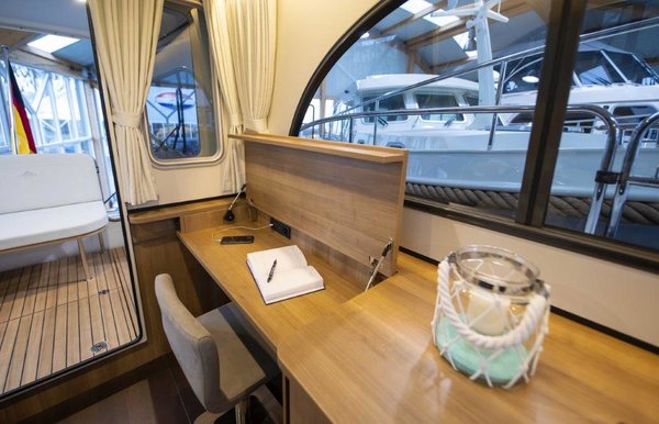 In the saloon is the helm position with extensive dashboard and a nice steering bench. There is a spacious sliding roof at the steering position.