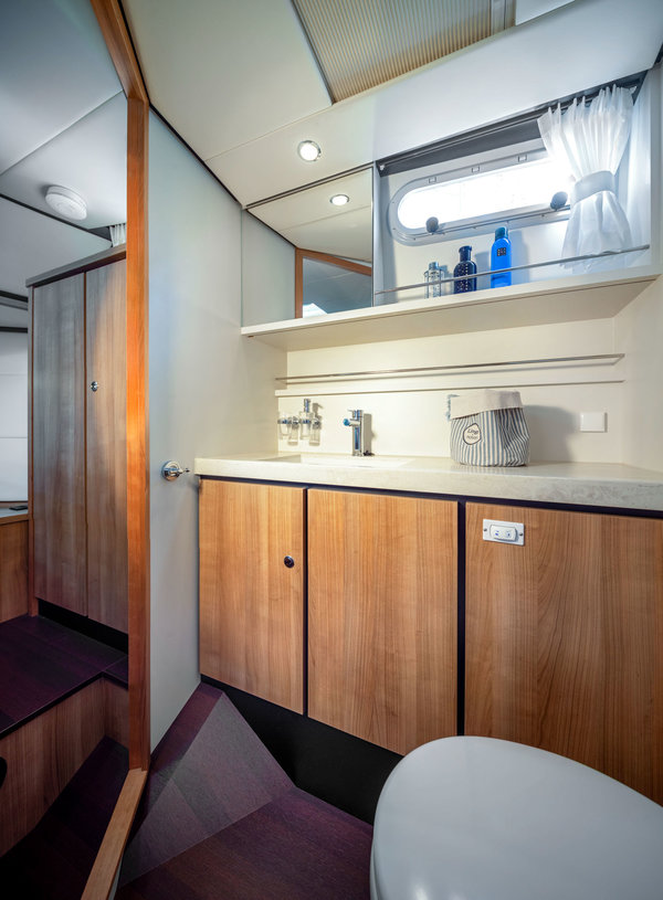 The boat is equipped with two sleeping cabins. One cabin has a free-standing double bed and the other cabin has 2 single beds. There is also a spacious bathroom and a toilet.