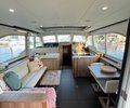 In the cockpit is a nice spacious sofa and a dining table. The open cockpit has a continuous long-top with atmospheric lighting. The cockpit can be completely closed to an extension of the salon.