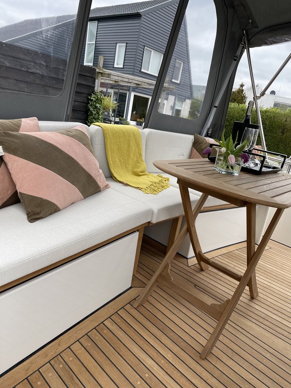 Aan dek is ruim zitplaats op de vaste bank met fijne kussens en het achterdek is rondom de bank geheel afsluitbaar met een extra grote cabriotent.