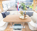 In the wheelhouse, the dashboard is equipped with all conceivable navigation tools and above the steering bench is the Variotop, which can be operated electrically. There is ample seating in the wheelhouse, as well as a small kitchen with an extra refrigerator. This part of the boat can be completely closed with solid doors and heated. Furthermore, on the afterdeck there is a spacious bench with a height-adjustable table that can easily be converted into a lounge bed. This section, the aft deck, can also be completely closed off with a convertible top (not shown in the photos). The bathing platform has been extended and is retractable, making swimming even more fun!