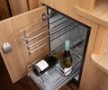 The interior is characterized by a sophisticated layout made of cherry wood and luxurious materials such as Corian sheets and leather in a light, tasteful color scheme. In the spacious salon, the sofa can be transformed into a large double bed.