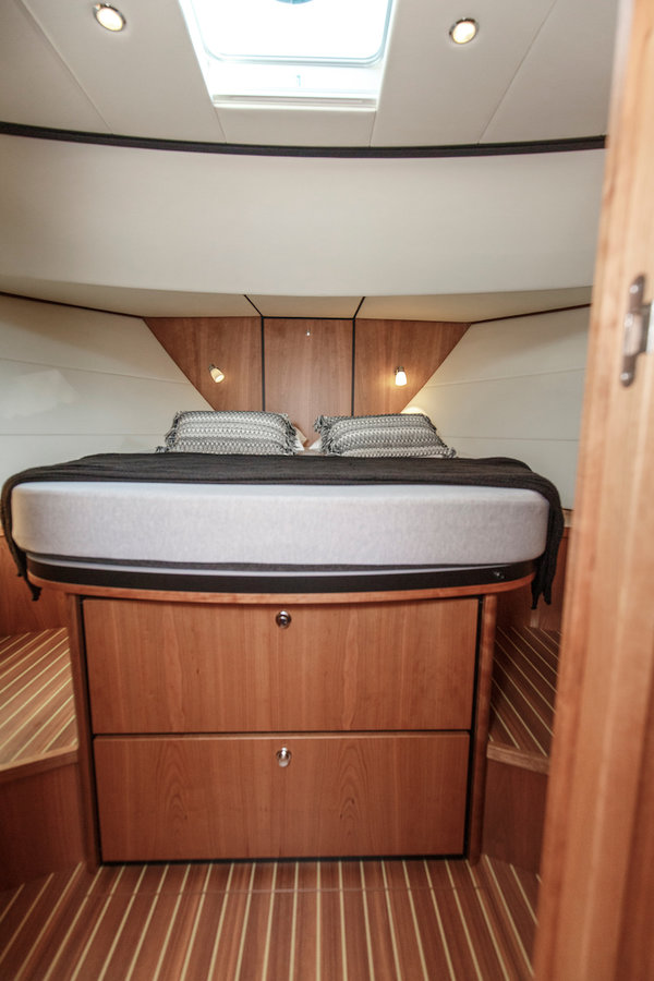 The boat is equipped with two cabins. One cabin has a detached double bed and the other cabin has 2 single beds. There is also a very spacious bathroom with a toilet and a separate large shower on the starboard side.
