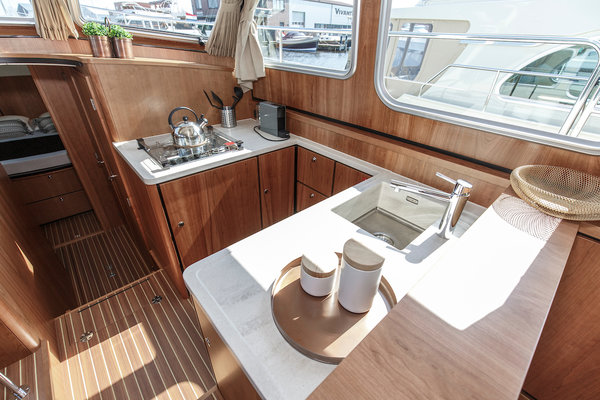 The kitchen is fully equipped for a long and pleasant stay on board.