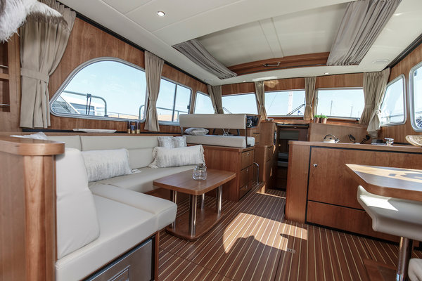 In the cockpit is a nice, spacious couch and a dining table. The open cockpit has a continuouos long top with atmospheric lighting. The cockpit can be closed completely so that the salon is extended.